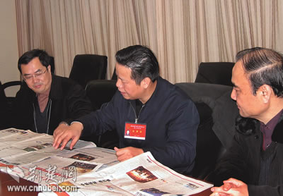 張昌爾說,各新聞單位高度重視“兩會”報道,會前充分準(zhǔn)備,作了周詳計劃。會中派出精兵強將,全力以赴。報紙、電視、廣播的報道各自亮點頻出,手法多樣,可讀性可視性可聽性大大增強,較好地反映了代表委員參政議政的風(fēng)采。他希望參加“兩會”報道的新聞工作者繼續(xù)努力,更多地關(guān)注基層代表委員的聲音,報道他們在社會主義民主制度建設(shè)中發(fā)揮的作用,為重大政治性戰(zhàn)役報道落實“三貼近”原則積極探索。圖為張昌爾在評點湖北日報“兩會在線”。
