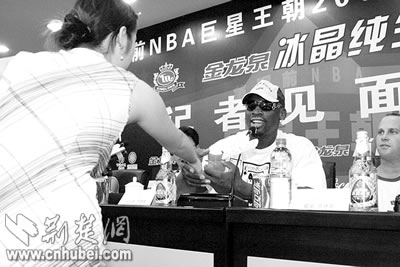 “大蟲(chóng)”似乎不為所動(dòng),拿起行李,在保安的保護(hù)下向外走。記者們忙起來(lái)了,兩位來(lái)自電視臺(tái)娛樂(lè)頻道的記者拿著話筒,沖到羅德曼面前,踮起腳跟,不斷用英語(yǔ)發(fā)問(wèn)。