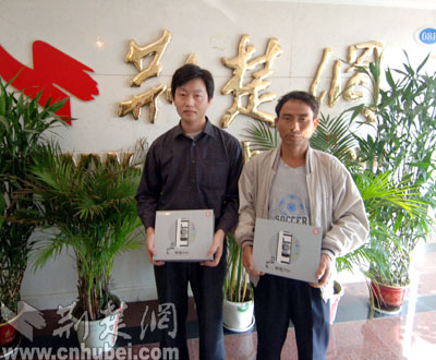 荊楚網(wǎng)24日訊 記者艾丹 潘頔 報(bào)道:23日抽出的“讀報(bào)紙、發(fā)短信、中手機(jī)”活動(dòng)的兩位幸運(yùn)獲獎(jiǎng)?wù)撸錆h的李先生和谷城的孟先生,今天下午來到荊楚網(wǎng)領(lǐng)獎(jiǎng),荊楚網(wǎng)總編輯閻思甜親自為他們頒獎(jiǎng)。