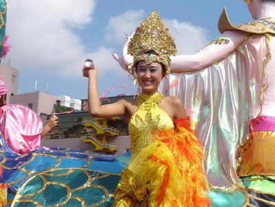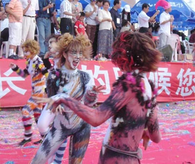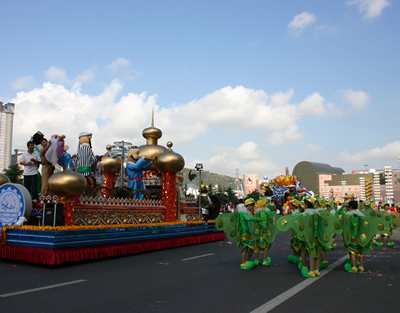 今天上午在新海廣場(chǎng)舉行的第六屆大連狂歡節(jié),更是使歡樂(lè)的海洋里掀起了歡樂(lè)的海潮。來(lái)自國(guó)內(nèi)外的24支狂歡巡游隊(duì)伍,以花團(tuán)錦簇的民族服裝和極度夸張的藝術(shù)手法,演繹了航天、花神、特洛伊木馬、梁山伯與祝英臺(tái)、孔雀仙子、海底動(dòng)物、蝴蝶服飾、阿凡提、醉酒、美人魚、回娘家、貓友、豪華游覽馬車、日月潭傳說(shuō)、堂吉訶德、木偶奇遇、狐假虎威、寶蓮燈、海娃與王子、小櫻丸子、尼爾斯騎鵝記、阿里巴巴、輪滑表演等國(guó)內(nèi)外著名童話,電影故事等。最為耀眼的是以音樂(lè)劇《貓》的扮相出場(chǎng)的表演隊(duì)伍,他們獨(dú)特的表演和造型贏得了在場(chǎng)觀眾最多的歡呼聲。狂歡的服裝藝術(shù)巡游,吸引了數(shù)萬(wàn)國(guó)內(nèi)外游客和當(dāng)?shù)孛癖姷挠^賞。