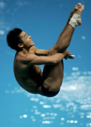 2005年10月5日,十運(yùn)會(huì)跳水決賽最后一天的比賽在南京奧體中心落幕。在男子單人1米板的決賽中,預(yù)賽中排名第一位的廣東新秀何沖一掃在3米板比賽中沖金失利的陰影,憑借最后兩跳近乎完美的表現(xiàn)以總成績500.01分獲得冠軍。上海老將王天凌則以490.32分獲得銀牌,另外一名廣東選手羅玉通以466.53分摘得銅牌。解放軍名將彭勃和代表山東參賽的衛(wèi)冕冠軍王峰則因?yàn)樵诒荣愔谐霈F(xiàn)重大失誤,分別以447.12分和435.66分名列第五和第八位。圖為何沖在比賽中。(中體在線圖片 李錦河 攝)