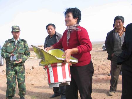 記者在搜索現(xiàn)場看到,從四面八方趕來的牧民群眾個個都有所獲。“哈呀,人們常說天上掉餡餅,這不應驗了?”牧民張金虎指著自己撿到的一堆殘骸,興奮地開著玩笑。牧民烏云還向記者炫耀,她和丈夫烏力吉今天特意起了個大早,在家焚香默默祝愿神舟六號飛船試驗成功,所以今天他們撿到的殘骸最多,能裝滿滿一車。