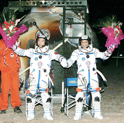 費俊龍、聶海勝隔著舷窗,在向人們招手———返回艙內(nèi)柔和的燈光,映著他們的微笑。這一刻,距他們離開大地4天又19個多小時,他們的總行程為325萬余公里。