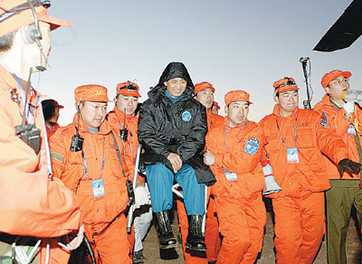 5分鐘后,兩名航天員在工作人員的簇?fù)硐拢M(jìn)入著陸點100米開外的一架直升機(jī)內(nèi)全面體檢,工作人員和群眾在外焦急地等待最后的檢查結(jié)果。