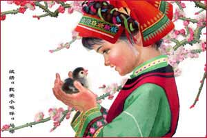 絨繡:在各種絲、綢、緞上,以平繡針法用絲絨繡出平的畫面;題材多為飛禽、博古,用作畫片、掛屏等。