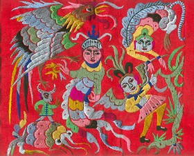 苗繡 刺繡,是苗族婦女盛裝不可或缺的飾物,主要有領(lǐng)花、肩花、襟花、背塊花、袖口花、裙鑲花、帽頂花、帽頂花等品種。苗族刺繡,整體上多為幾何構(gòu)圖,古樸多姿。其圖案因繡片條、塊的不同,分為幾何二方連續(xù)式和四方連續(xù)式構(gòu)圖。其圖案取材于生活中常見(jiàn)的草木、鳥(niǎo)獸、蟲(chóng)魚(yú)、器具等。圖案的整體布局一般以菱形為立體紋樣,常見(jiàn)的是大菱形中套小菱形,小菱形又分別由不同色彩的方、圓、三角點(diǎn)狀組成。條狀繡片,多用點(diǎn)、線或線面組合,一整二剖構(gòu)圖。繡片是按布的經(jīng)緯戳針,故曲線多折角。大塊繡片,如背塊花等,多用菱形四方連續(xù)構(gòu)圖,并在其中布以對(duì)稱(chēng)的變形幾何點(diǎn)及其他折線。所有繡片,粗看五彩斑斕,細(xì)觀則不同色線組圖分明,交錯(cuò)重疊,既復(fù)雜多變又結(jié)構(gòu)嚴(yán)謹(jǐn)、條理清晰。繡法很多,有平繡、凸繡、辮繡、堆花、縐繡、纏繡、挑繡、抽花等。平繡是最曾遍的繡法。這種繡法是重于圖案布局的美觀勻稱(chēng),色調(diào)鮮明,有明顯的物象感。凸繡流行于凱里、臺(tái)江部分地區(qū),它是在底布上多鋪幾層紙花,使所繡圖案凸出,有立體感。辮繡只在雷公山巴拉河一帶流行,其方法是將若干根色線編成辮子,按設(shè)計(jì)圖案平鋪于底布上,用絲線釘牢即成。圖案色調(diào)大致是青年女子鮮艷,中年以上婦女稍渾暗。如凱里、黃平、施秉等地,姑娘及較年輕婦女的盛裝刺繡以青布作底,繡大紅,間有少量白黃綠之色,亮麗醒目;中年以上婦女盛裝刺繡,亦以青布作底,以紫藍(lán)為基調(diào),間以少許桔紅、綠、白等色,顯得深沉穩(wěn)重。 京繡 京繡又稱(chēng)宮繡,明清時(shí)期開(kāi)始大為興盛,多用于宮廷裝飾、服飾,用料講究、技術(shù)精湛、格調(diào)風(fēng)雅,民間高檔的宮繡大都與皇宮有著千絲萬(wàn)縷的聯(lián)系。京繡屬手工刺繡,所以在今天機(jī)繡發(fā)達(dá)的時(shí)候,為區(qū)別于機(jī)繡又名“手繡”。京繡在解放后,逐漸形成了自己鮮明的藝術(shù)特點(diǎn)與風(fēng)格,其選料精當(dāng)貴重,針工巧妙得體,色彩絢麗豪華,格調(diào)高雅。其中最好為針工中的“平金打籽”繡。這種繡,是以真金捻線盤(pán)成圖案,或結(jié)籽于其上,十分精致,華貴。 發(fā)繡 發(fā)繡,又稱(chēng)“墨繡”。是以人的頭發(fā)為材料,在綢緞、絲絹或滌綸布上精心繡制的特種藝術(shù)品。具有淡雅、不褪色、耐腐蝕、利于收藏等特點(diǎn)。彩色發(fā)繡是相對(duì)于單色發(fā)繡而言,它是指以不同人種的天然色澤發(fā)絲為材料,遵循色彩規(guī)律,在繃平整的布帛上施針度線,塑造形象的藝術(shù)。作品的質(zhì)感效果特別好, 畫(huà)面有微妙的色彩變化,層次較單色發(fā)繡豐富,技巧靈活多變,形象更加栩栩如生。 材料的特質(zhì)屬性賦予發(fā)繡藝術(shù)獨(dú)特的魅力,具有豐富的人文內(nèi)涵,如用自己的頭發(fā)繡一幅寫(xiě)真“二我”,具有生命的直接紀(jì)念意義。作品集繪畫(huà)與刺繡為一體,具有一定的美學(xué)價(jià)值和經(jīng)濟(jì)價(jià)值,又能經(jīng)久保存,千年不變,可謂收藏極品。 甌繡 由于溫州地處甌江之濱,故得名“甌繡”。400多年以前,浙江溫州地區(qū)已運(yùn)用刺繡美化服飾, 繡品技藝也達(dá)到相當(dāng)水平。據(jù)說(shuō)甌繡最早產(chǎn)生于民間婦女之手,那時(shí)的刺繡品種有衣服、小兒帽 圈、圍涎、錦肚、婦女鞋面、枕頭、荷包等。題材只有花鳥(niǎo)魚(yú)蟲(chóng)之類(lèi)。甌繡真正成為供欣賞的藝 術(shù)品只有60多年歷史。1922年前后,溫州刺繡藝人林森友在上海一家刺繡莊發(fā)現(xiàn)了湘繡畫(huà)片, 回來(lái)后開(kāi)辦了“美艷”刺繡作坊,仿照湘繡畫(huà)片的技法,改進(jìn)甌繡生產(chǎn)。從此,溫州出現(xiàn)了甌繡畫(huà)片。