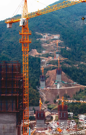 龍?zhí)逗犹卮髽蚓o鄰長陽縣榔坪鎮(zhèn),是滬蓉西高速公路上一座T構(gòu)箱梁橋,主橋墩最高178米,居世界同類橋高墩之最!耙娺^這么高的塔吊沒?”戴上安全帽,湖北路橋公司項目經(jīng)理夏君華帶記者一行踏訪工地。