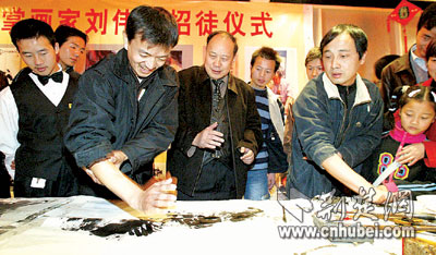 12點,比拼結(jié)束,張俁俁、萬正濤、武大學(xué)生張艷平等10人順利地成為劉偉新的入室弟子!八麄兡贻p、書畫功底扎實,看來我的掌畫將后繼有人!眲バ乱荒樞σ。