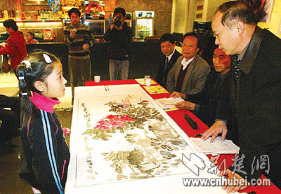 “劉老師,看看我的畫吧!”9歲的張俁俁是武昌中華路小學(xué)學(xué)生,她第一個交出自己的牡丹長卷請老師“檢閱”。陪同前來的母親吳女士在一旁介紹:“俁俁看到報紙后就一直惦念這事。今天一早她就起床了,拉著我跟她外婆往這趕!