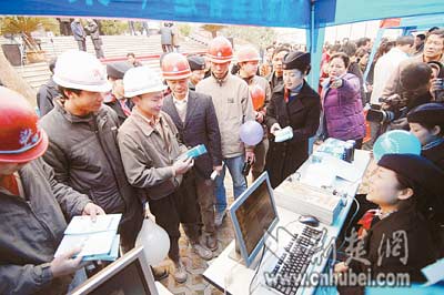 昨日,武漢市總工會大院內(nèi),農(nóng)民工“平安返鄉(xiāng)”票務(wù)趕集會正在舉行。武漢鐵路局、湖北公路客運集團(tuán)等單位在這里擺臺設(shè)點,共同為農(nóng)民工提供票務(wù)預(yù)訂服務(wù)。來自武漢市16個單位的500多名農(nóng)民工代表參加了趕集會。(記者張磊江卉通訊員賀鵬攝)
