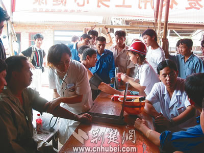 15日,參加武鋼工程建設(shè)的百余位農(nóng)民工兄弟,樂呵呵地接受了中國一冶電裝公司武鋼項目部為他們免費進(jìn)行的體檢。浠水工程隊民工朱宗杰說:“這兩年來,社會各界對農(nóng)民工的關(guān)心很實在。”