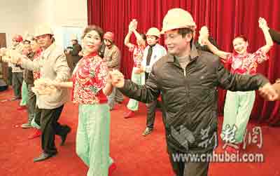 荊楚網(wǎng)(楚天都市報)昨日,漢口百步亭花園居民自編自演了一臺文藝節(jié)目,奉獻給為該社區(qū)建設作出貢獻的農(nóng)民工們。演出中,市民熱情邀請農(nóng)民工朋友登臺跳舞。