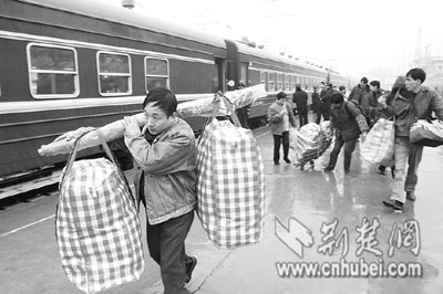 ?10分鐘后,這趟民工專列駛離武昌站,于昨晚20時(shí)20分到達(dá)襄樊。據(jù)武昌站介紹,節(jié)前的民工專列多從南方發(fā)往武漢,節(jié)后武漢鐵路局將加開大量南下、東進(jìn)的民工專列。