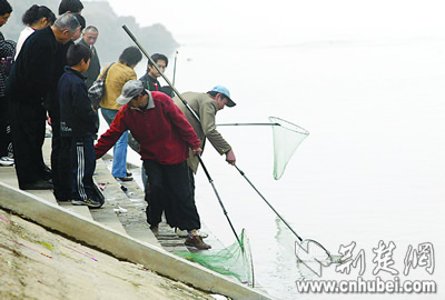 荊楚網(wǎng)(楚天都市報(bào))記者陳曙光 葉茂林 實(shí)習(xí)生 楊子鈺 王高偉:昨日上午,一群市民來到長江一橋下武昌江灘,將一批小魚放生,很快便有人在放生處捕撈。