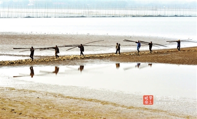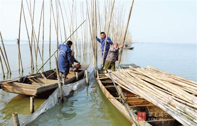 一旁,駕駛著機船的漁民們,或忙著收網(wǎng),或配合將割下的竹子運回岸邊。船只在湖面上留下道道漣漪,灘涂上抗著竹子的漁民蜿蜒成一幅畫。