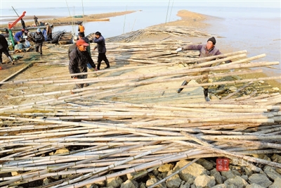 一根根圍桿被運上岸。