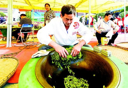 湖北日?qǐng)?bào)訊 5日至6日,咸寧首屆手工制茶賽在潛山廣場舉行。這次比賽集聚了來自咸安、崇陽等6個(gè)縣市區(qū)的手工制茶高手,評(píng)比出10組“制茶王”,旨在推動(dòng)手工制茶非物質(zhì)文化傳承,壯大茶產(chǎn)業(yè)。(視界網(wǎng) 雷平 攝)
