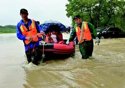 圖為:通城四莊鄉(xiāng)小井村道路被洪水阻斷,消防劃艇轉(zhuǎn)移村民