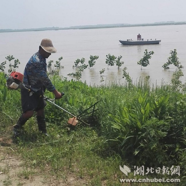 站在簰洲灣堤上,只見江水寬闊,水質混濁,岸邊的防浪林樹干已被淹沒大半,只露出一蓬蓬的樹枝。原本空曠的堤頂公路,多了一些哨棚。內岸邊,星散分布的群眾,手持鐮刀或除草機,正在忙碌地清障除雜。每隔一段距離,都有一個防汛哨屋,鮮艷的五星紅旗迎風飄揚,各個分指揮部已經(jīng)設立。