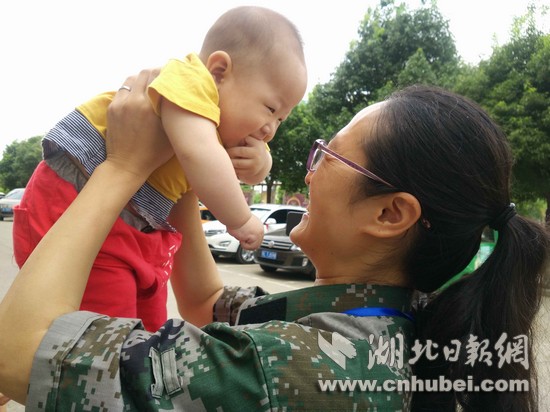湖北日報網(wǎng)訊(全媒體記者 張愛虎 通訊員 江開群 秦修)6日上午8時30分,嘉魚縣陸溪鎮(zhèn)鎮(zhèn)長路紅云,到縣防指辦理防汛物資報領(lǐng)手續(xù),忙完后下樓,正是9時10分,見到婆婆抱著5個多月的兒子蕗熙趕來。乘著采訪的間隙,一身戎裝、皮膚黧黑的路紅云抱著兒子逗玩。