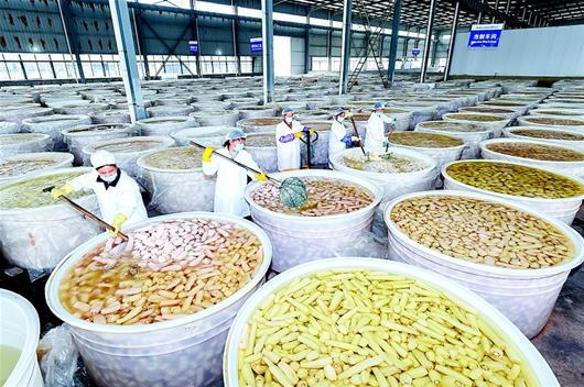 湖北日報訊 眼下,正值蓮藕收獲季節(jié)。位于嘉魚縣陸溪鎮(zhèn)的嘉珍生態(tài)農業(yè)發(fā)展有限公司車間內,工人們正在開封、準備啟運泡制的蓮藕產品。2012年嘉魚珍湖蓮藕登上《舌尖上的中國》后名聲大噪,國家質檢總局近日正式批準“嘉魚蓮藕”為國家地理標志保護產品。目前,嘉魚縣每年生產蓮藕、蓮子和藕帶6萬多噸,產品銷往全國各地,并出口到歐美和東南亞等地區(qū)。(記者 陳勇 視界網 龍鈺 攝)
