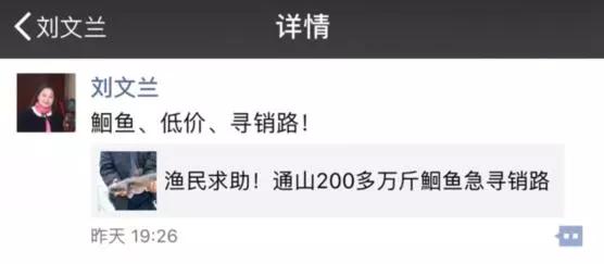 和丁小強(qiáng)一樣,中百超市副總經(jīng)理劉文蘭,也在朋友圈轉(zhuǎn)發(fā)了湖北日?qǐng)?bào)的微信稿件,并配文:“鮰魚(yú)、低價(jià)、求銷(xiāo)路”,幫忙推廣。