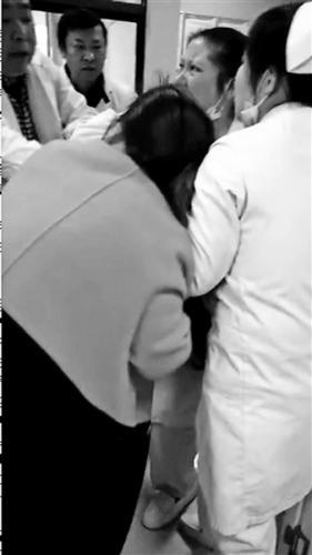 視頻顯示,女護(hù)士被醫(yī)院其他醫(yī)護(hù)人員護(hù)在一邊,靠著墻壁滑坐在地上,捂著肚子哭泣。另一名女子情緒激動(dòng),在撲向該護(hù)士時(shí)被幾名醫(yī)護(hù)人員攔住后喊著:“我要見你們?cè)洪L?!?/p>