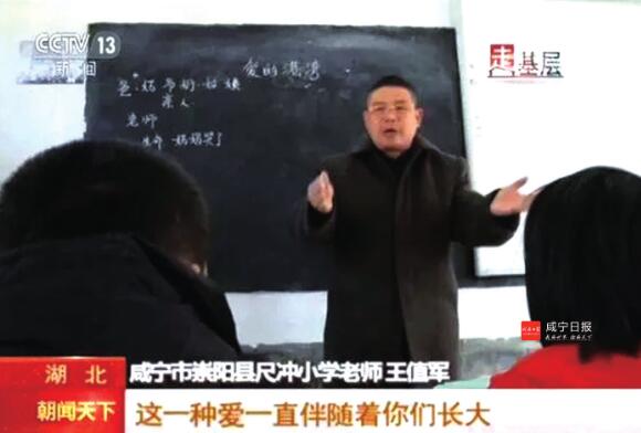 在剛剛過去的元旦佳節(jié),央視《朝聞天下》欄目播出了一則《大山里的擺渡老師》的新聞,在本地教育系統(tǒng)刷屏。新聞的主人公就是崇陽縣尺沖小學(xué)教師王值軍,在這則近8分鐘的新聞里,記錄了王老師接送學(xué)生上下學(xué)、上課、走訪留守兒童家庭等日常工作生活常態(tài),展現(xiàn)農(nóng)村教師堅守大山,關(guān)愛學(xué)生的高尚道德情操。