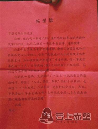 “尊敬的張向溫先生,您寄來(lái)的3000元捐款我們已經(jīng)收到,在此,平邑縣紅十字會(huì)全體工作人員并代表受助人員向您表示衷心地感謝和崇高的敬意……”這是山東省平邑縣紅十字會(huì)于2016年給張向溫寄的感謝信中的一段話。