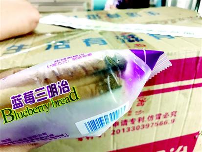 在該校三樓,記者看到了一袋發(fā)霉的面包,包裝上寫著“藍(lán)莓三明治”,生產(chǎn)日期是2018年5月14日,保質(zhì)期180天,生產(chǎn)廠家是“湘潭鄭福記食品有限公司”。這袋面包有三片,其中一角已經(jīng)發(fā)霉變黑。