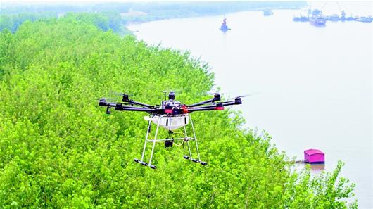 湖北日報訊 6月12日,在嘉魚縣長江干堤陸溪段,無人機在防浪林上空噴灑低毒無殘留農藥,防治病蟲害。近期,嘉魚段長江防浪林出現(xiàn)了蟲卵和幼蟲,嘉魚縣林業(yè)局迅速進行綜合防治,全面維護從陸溪至簰洲灣109公里長江沿線及洲灘6萬余畝楊樹林。