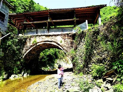 石城鎮(zhèn)文化站站長龔益來介紹,2015年6月2日暴雨,石橋部分被沖毀。他聯(lián)系上從塔坳村走出去的加拿大籍華人汪十友,募資10萬元,加上鄉(xiāng)鄰捐助,花費13萬余元于當(dāng)年9月重修。為整舊如舊,橋基上的壘石仍保留當(dāng)年瑤族先民的遺存,清光緒十四年的修橋記錄原樣保存在前面橫梁上,此次修橋記錄則刻在后面橫梁上。
