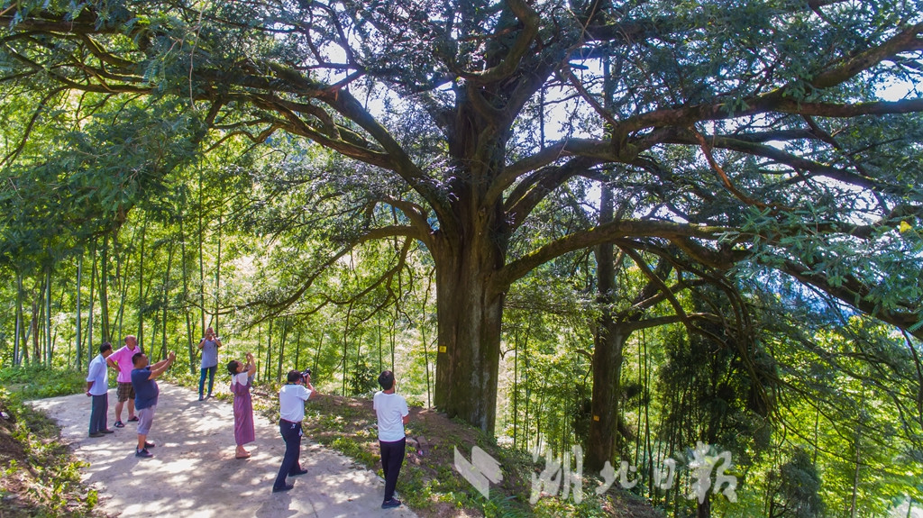 湖北日報訊(記者 陳勇 通訊員汪佳、黎志遠(yuǎn))7月16日,在崇陽縣港口鄉(xiāng)大東港村,兩棵古香榧樹歷經(jīng)千年仍枝繁葉茂、碩果累累,令游客驚嘆不已。這棵雌性香榧樹高25米,樹冠面積約有650平方米,胸圍4.9米,估測樹齡在980年至1200年之間。香榧,紅豆杉科,中國原產(chǎn)樹種,是世界上稀有的經(jīng)濟(jì)樹種。崇陽縣林業(yè)部門在幕阜山南坡發(fā)現(xiàn)這兩株古香榧樹,認(rèn)為有很高的科研和經(jīng)濟(jì)價值,列入一級保護(hù)的古樹名單。