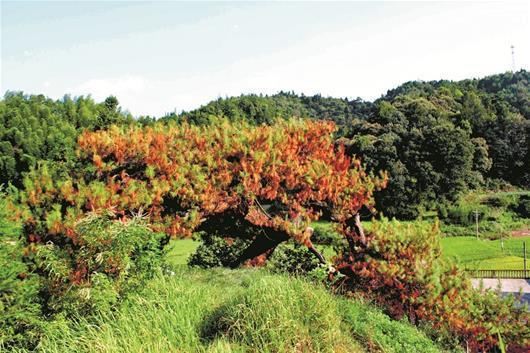 村民們介紹,今年8月8日左右,他們出門干活時(shí),抬頭發(fā)現(xiàn)這棵古樹有部分針葉發(fā)黃。村民感覺不對(duì),立即找到村支書反映,村支書迅速上報(bào)九宮山鎮(zhèn)政府及林業(yè)部門。鎮(zhèn)政府高度重視,鎮(zhèn)林業(yè)站站長成獻(xiàn)忠緊急趕往現(xiàn)場查看后,向縣森防站求助。