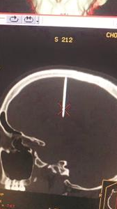 胡師傅說(shuō),他今年43歲,在崇陽(yáng)一家水泥廠上班,家中有兩個(gè)孩子,都在上學(xué)。前幾天,他感覺(jué)頭很疼,腦袋靠近右耳的地方像長(zhǎng)了東西一樣。到了5日晚上,他實(shí)在忍不住疼痛,來(lái)到崇陽(yáng)縣人民醫(yī)院檢查?!昂币?jiàn)!”接診的醫(yī)生檢查后,也沒(méi)有發(fā)現(xiàn)異樣,血壓什么的都正常。醫(yī)生建議拍片看一看,CT片子拍出來(lái)了,醫(yī)生一看嚇了一跳:胡師傅右額顱內(nèi)有根釘子,長(zhǎng)達(dá)48毫米。