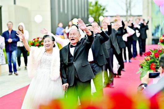 楚天都市報(bào)訊(通訊員繆北辰 記者周鵬 實(shí)習(xí)生李亞輝)昨日上午,12對(duì)老年夫妻在中建三局咸寧項(xiàng)目工地身著婚禮服,一起牽著手走紅地毯,補(bǔ)辦集體婚禮,幸福地彌補(bǔ)了當(dāng)初結(jié)婚時(shí)的遺憾,追憶了一番青春歲月。