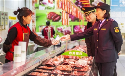 12月27日,武邑縣食品和市場(chǎng)監(jiān)督管理局執(zhí)法人員在一家超市檢查肉類(lèi)銷(xiāo)售人員的健康證。