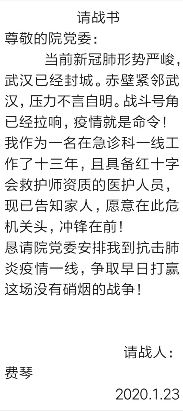 “我作為一名在急診科一線工作了十三年,且具備紅十字會(huì)救護(hù)師資質(zhì)的醫(yī)護(hù)人員,現(xiàn)已告知家人,愿意在此危機(jī)關(guān)頭,沖鋒在前?!边@是來(lái)自市人民醫(yī)院急診科醫(yī)護(hù)人員費(fèi)琴的請(qǐng)戰(zhàn)書(shū)內(nèi)容,讓人淚目。