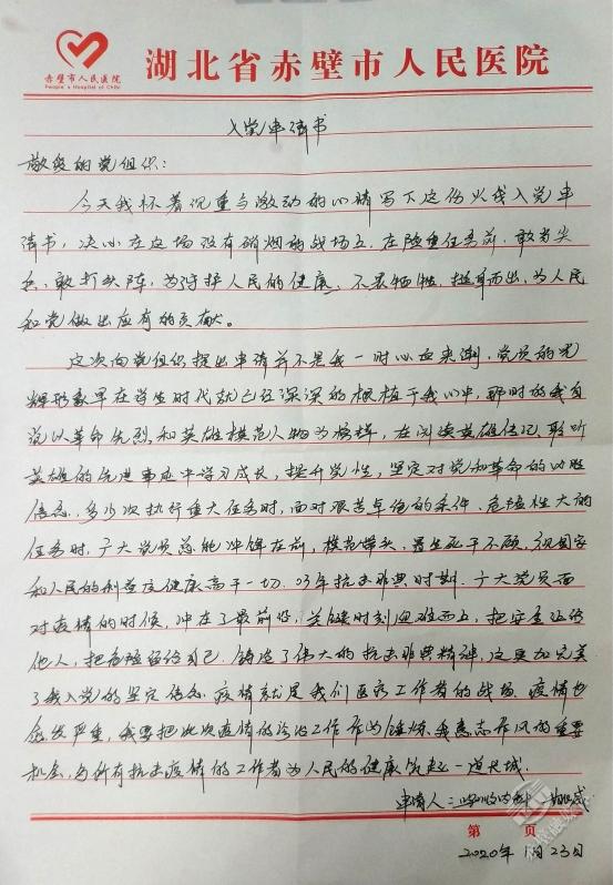 “今天我懷著無(wú)比激動(dòng)的心情寫(xiě)下這份入黨申請(qǐng)書(shū),決心在這場(chǎng)沒(méi)有硝煙的戰(zhàn)場(chǎng)上,不畏犧牲,挺身而出?!边@是來(lái)自市人民醫(yī)院90后呼吸內(nèi)科住院醫(yī)師姚威的入黨申請(qǐng)書(shū)。