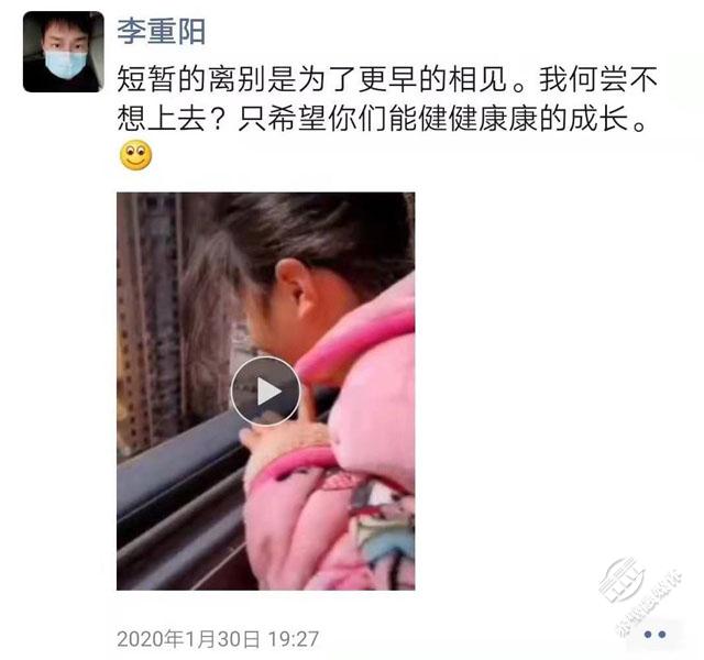 李重陽(yáng)是中心消殺隊(duì)伍中的一員,1月29日,正值大年初五,已經(jīng)近10天沒(méi)回家的他接到了到自己所住小區(qū)開(kāi)展消殺工作的任務(wù)。所有工作完成后,他只能在樓下?lián)芡ㄒ曨l,遠(yuǎn)遠(yuǎn)的看了一眼妻子,聽(tīng)著兒女叫了一聲“爸爸”。當(dāng)天,李重陽(yáng)發(fā)了這樣一條朋友圈:“短暫的離別是為了更早的相見(jiàn)。我何嘗不想上去?只希望你們能健健康康的成長(zhǎng)?!崩钪仃?yáng)只是赤壁疾控眾多年輕消殺隊(duì)員的一個(gè)代表。很多人無(wú)聊的“家”,正是他們一線疫情防控人員想回卻回不去的“家”。