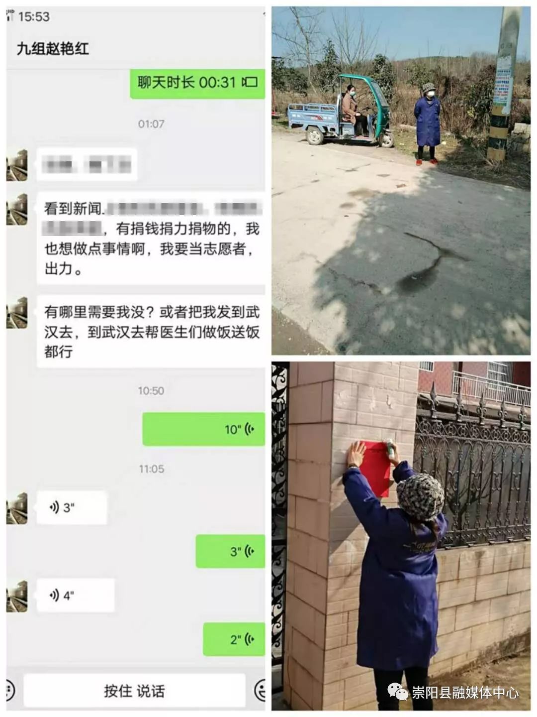 “有哪里需要我嗎?我要當(dāng)志愿者,哪怕是到武漢去為醫(yī)生做飯送飯都行。”這是青山鎮(zhèn)城萬村九組村民趙艷紅2月2日凌晨1點(diǎn),向村婦聯(lián)主席發(fā)出的“請戰(zhàn)”信息。