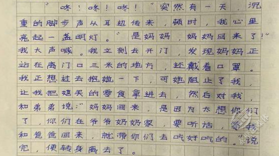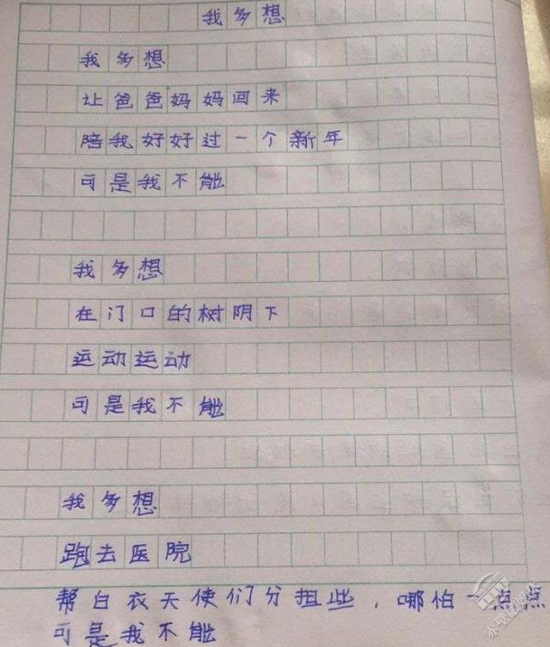 夫妻倆的大寶二寶,被托付給爺爺奶奶照料。多日不見父母,他偷偷寫下一首詩(shī)《我多想》:“我多想,讓爸爸媽媽回來,陪我好好過一個(gè)新年,可是我不能……我多想,跑去醫(yī)院,幫白衣天使分擔(dān)一些,哪怕一點(diǎn)點(diǎn),可是我不能……”字里行間,流溢出滿滿的思念。