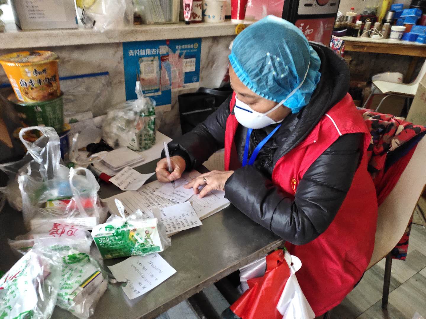 張斌翔負責清點定點超市配送的物資,他對照清單點清、收貨,然后發(fā)放、收款,每天開著三輪車送貨,最早到崗,最晚回家。下大雪那天,晚上七點多,送完最后一家生活物資返回時,因天黑路滑,車撞到護攔上,他的頸部受傷,腿也摔腫了。他忍痛回家,簡單處理傷口,第二天早晨八點,又出現(xiàn)在供應點上。大家讓他休息,他說,輕傷不下火線,供應點少一個人,就更忙不過來,堅持不肯離開。