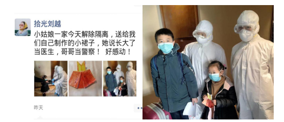 隔離解除,依依惜別,萌娃兄妹把精心制作的手工,送給日夜相伴的“拾光劉越”等醫(yī)護(hù)人員?!伴L大也要當(dāng)醫(yī)生、當(dāng)警察?!敝蓺獾脑捳Z,讓“拾光”感動(dòng)。
