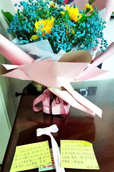 自稱(chēng)為“云南小姐姐”的萬(wàn)麗萍,將一束開(kāi)得正艷的花和兩張小紙條擺在桌上?!坝窀?,我怕分別時(shí)的淚崩,給你留了小紙條。咸寧的55天,感謝你無(wú)微不至的照顧,把我們一個(gè)個(gè)養(yǎng)得胖了一大圈。雖然回去要減肥,還是感恩、感謝!”