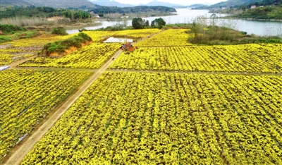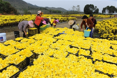 11月4日,通山縣燕廈鄉(xiāng)湖畔村皇菊種植基地,金絲皇菊怒放,猶如一張金色地毯舒展在田野上,村民穿梭在花叢中采收菊花。燕廈鄉(xiāng)湖畔村是典型的庫區(qū)貧困村,近年來,市公共檢驗(yàn)檢測中心駐村工作隊(duì)和燕廈鄉(xiāng)黨委政府結(jié)合湖畔村地理環(huán)境,成立村集體合作社,打造60畝金絲皇菊種植基地,延伸菊花深加工產(chǎn)業(yè)鏈,通過與貧困戶采取“勞務(wù)聯(lián)結(jié)機(jī)制”簽署合同協(xié)議,讓村民實(shí)現(xiàn)家門口就業(yè)。