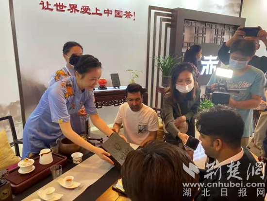 在高質(zhì)量互聯(lián)互通分論壇赤壁青磚茶展位,擠滿了前來品嘗赤壁青磚茶和茶點美食的嘉賓,茶藝師忙個不停,續(xù)杯、補充茶點,向嘉賓介紹赤壁青磚茶的歷史和特點,講解各類茶葉知識。