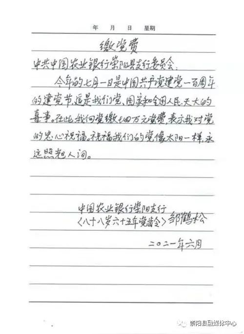 廖海峰告訴記者,來之前,鄒鶴松老人特意向中國農(nóng)業(yè)銀行崇陽支行黨委寫了一封信,信里這樣寫著:“今年是中國共產(chǎn)黨建黨100周年,這是我們黨、國家和全國人民天大的喜事。在此,我向黨繳納4萬元黨費(fèi),表示我對(duì)黨的衷心祝福。祝福我們的黨像太陽一樣,永遠(yuǎn)照耀人間?!币痪渚浜唵螛銓?shí)的語言,彰顯著一名老黨員赤心向黨、一心為黨樸實(shí)而偉大的情懷。