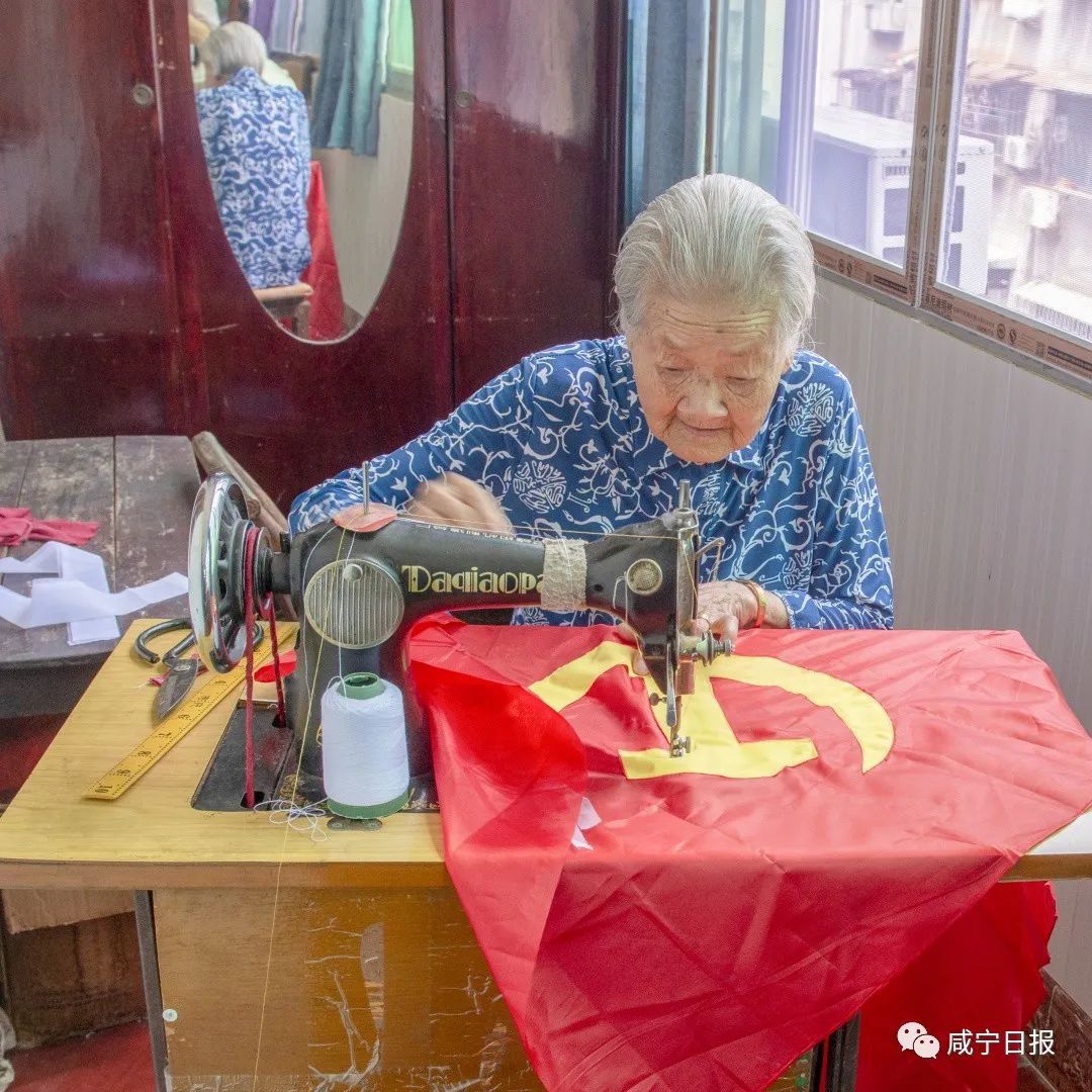 “得共產(chǎn)黨的力,才有今天的好生活。感謝毛主席!感謝共產(chǎn)黨!”6月15日下午,家住咸安區(qū)文筆路社區(qū)的百歲老人毛保玉在家人的陪同下,給區(qū)民政局送去一面親手縫制的黨旗。