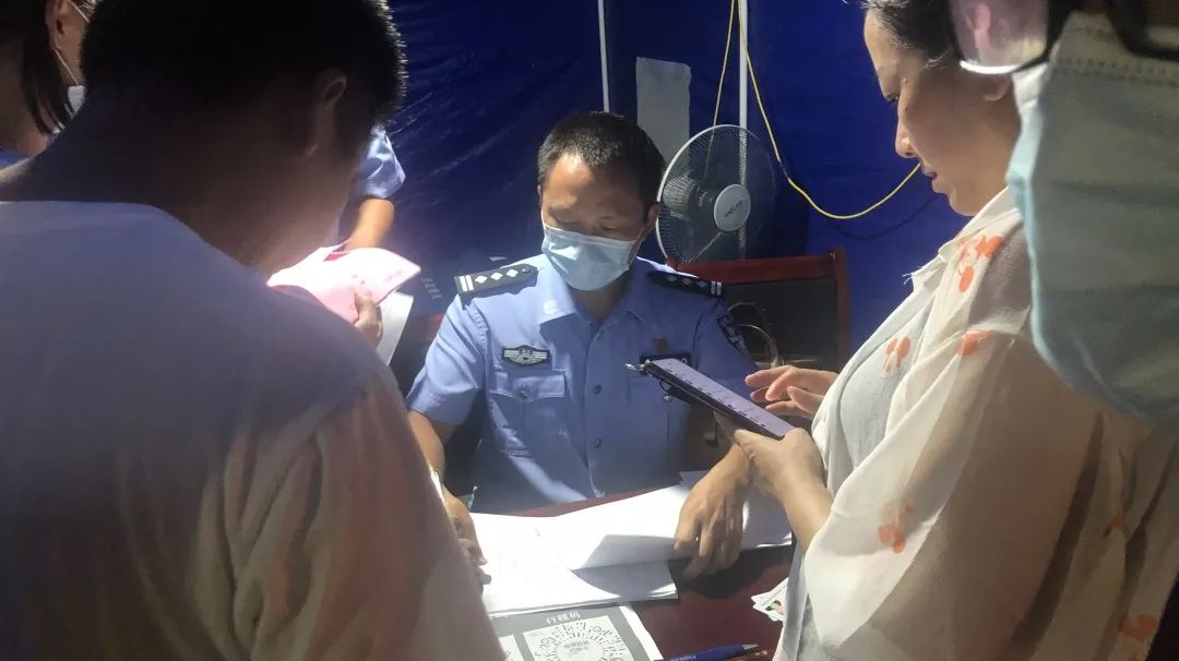 8月6日中午,氣溫近40攝氏度,熱風(fēng)滾燙。馬橋派出所民警雷剛早已汗流浹背,這是他和戰(zhàn)友當(dāng)天執(zhí)勤的第5個小時。截停車輛,測量體溫,登記錄入……雷剛不停重復(fù)著,被口罩和護(hù)目鏡遮得嚴(yán)實的臉龐,在太陽的燒灼中透著深褐,與頭頂?shù)陌咨弊有纬煞置鞯姆床睢?/p>